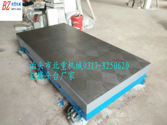鑄鐵劃線平臺鑄件成形后,進行回火時效,目的是為了消除劃線平臺鑄件的內應力。然后經刨床粗加工,刨去劃線平臺表面粗皮,獲得粗加工精度,然后再一次進行回火時效,消除加工及劃線平臺殘余應力?;鼗鸷蠼洈悼劂姶布庸け砻妫箘澗€平臺精度達到規(guī)定要求,然后人工刮研排點。