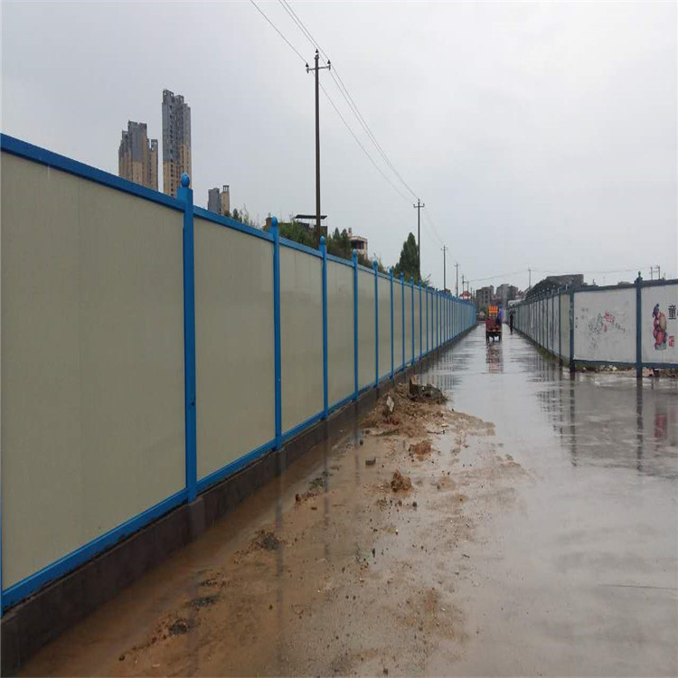 道路施工圍擋全體要求:路途施工安全圍擋現(xiàn)場(chǎng)四周應(yīng)連續(xù)設(shè)置不低于2.5米的圍擋,圍擋選用兩層0.58mm鋼板夾5cm厚芯的彩鋼板,彩鋼板高度為2.2米,外側(cè)藍(lán)色內(nèi)側(cè)乳白色。