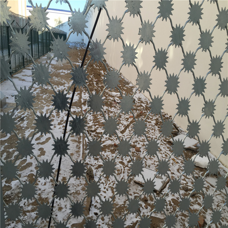 太陽花刺片圍網主要用在監獄鋼網墻,監區圍網,生產太陽花刺片隔離網,監獄金屬隔離網墻價格,蛇腹型刀片刺網