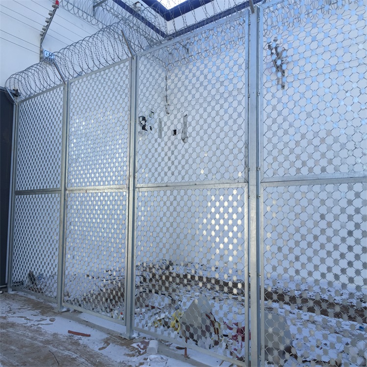 將不銹鋼拉絲固定在隔離網的頂部,形成一個v型托網用于架設蛇腹形刀刺網,將刀刺網按照12cm的間距均勻鋪設在v型支架上,用不銹鋼防拆卸卡扣與v型托網上的不銹鋼拉絲固定。在安裝完成后,對梅花刺片隔離網的防攀爬性能,進行跨越、防破壞測試。