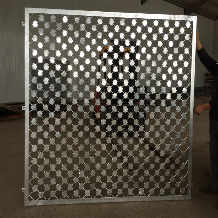 梅花刺片防護網因刺片像梅花得名梅花刺,因為形狀又像太陽,所以又被叫做太陽花防爬網。1、梅花刺片防護網為單層梅花刺片網,直徑不小于7.5cm,刺片厚1.5mm,采用Q235低碳鋼板沖壓成型。網片為菱形網孔,網格尺:120mmX110mm(高*寬),網絲直徑8mm,采用Q195線材高壓焊接,每一個焊點附焊梅花刺一個。立柱采用Q235鋼管,規格:直徑90圓管,方管厚度4mm。立柱低部直接焊接外徑140mm、厚度6mm法蘭盤;頂部預留四支直徑16mm圓孔,與電網支架末端相對應。立柱法蘭盤和支架法蘭盤分別整體熱鍍鋅處理。