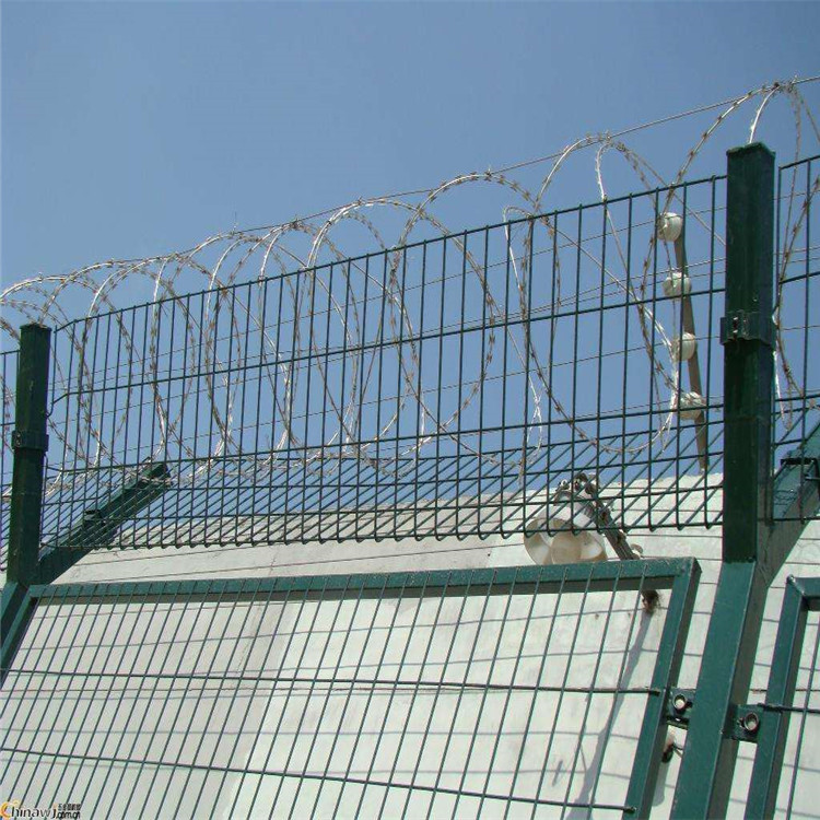 監獄防攀爬隔離網主要分鍍鋅,浸塑兩種,是以立柱網片加刀片刺繩制作而成。