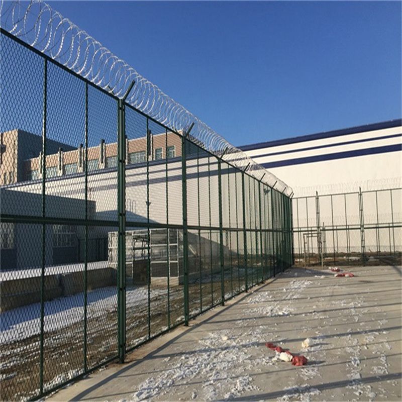 監(jiān)獄防護網(wǎng)又稱監(jiān)獄護欄網(wǎng)或監(jiān)獄隔離柵,主要是采用高強度的刀片刺網(wǎng)與普通防護網(wǎng)的結(jié)合,由V型支架立拄,加強型焊接片網(wǎng),安全防盜連接件和刀片刺網(wǎng)組成。刀片刺網(wǎng)是一種新型防護網(wǎng),由銳利尖角鍍鋅鋼板或不銹鋼薄板做刀片,鋼絲做芯線組合而成的防護器材。 監(jiān)獄防護網(wǎng)刀片刺網(wǎng)具有嚇阻、防翻越等效果,材質(zhì)堅硬,高強度,高張力,造型設(shè)計獨特,不宜觸摸,因而能達(dá)到很好的防護隔離效果。