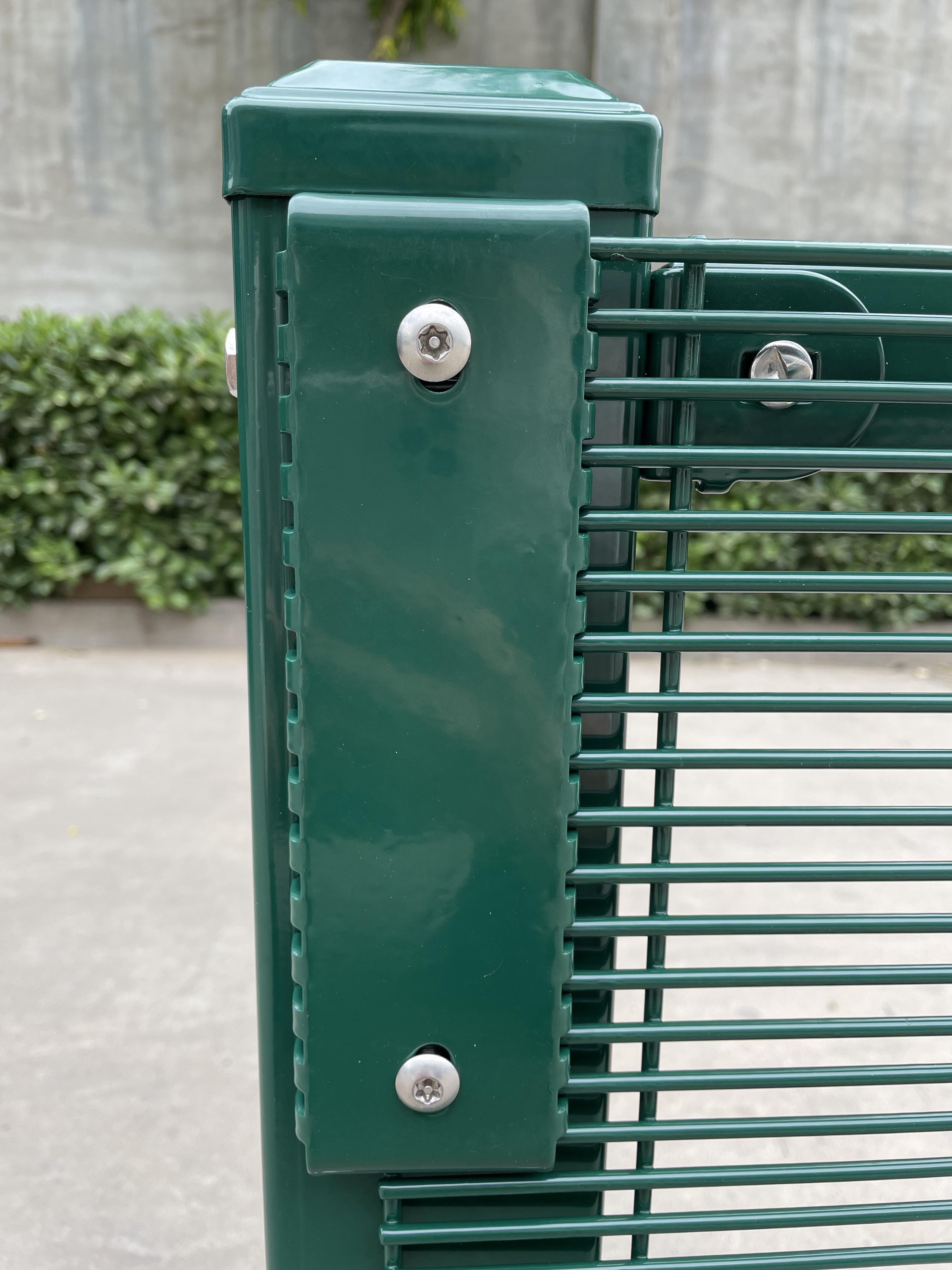 監獄金屬隔離網墻以2388mm長為一個制作、安裝單元,即金屬隔離網墻單元規格為2388mm(長)x4000mm(高)。每2388mm預埋螺栓(4個M16x300mm),其上安裝立柱一根,立柱底端焊接法蘭盤,法蘭盤與混凝土基礎內的預埋螺栓(4個M16x300mm)固定連接。網墻單元設計為具有邊框的隔離網片,邊框與立柱之間用熱鍍鋅螺栓和專用防拆螺栓固定。立柱上方焊接V型支架其上安裝φ600mm的蛇腹形不銹鋼刀刺網。