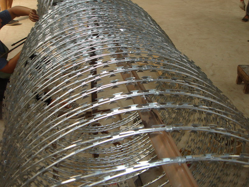 首先安裝我們要提前準(zhǔn)備使用工具,常用工具有手持式固定鉆,固定支架,固定拉線,鍍鋅卡扣。輔助工具主要 有鉗子和梯子或者爬架(適用于圍墻較高的地方)。固定支架是我們加工好的,底部有固定底座。使用手持式固定鉆把支架固定在需要的合適位置,-般相隔2. 5m或 者3m固定- -個(gè)。接下來(lái)就是把拉線設(shè)置好,每個(gè)支架的單臂上面有固定點(diǎn),每側(cè)可設(shè)置兩道或者三道。拉線固定就 是刀片刺網(wǎng)了,刀片剌網(wǎng)拆下包裝帶好防護(hù)手套,根據(jù)自己需要的密度把刀片刺網(wǎng)放在固定拉線上面,用鍍鋅卡扣 固定好。以上就是所有的安裝步驟及方法。