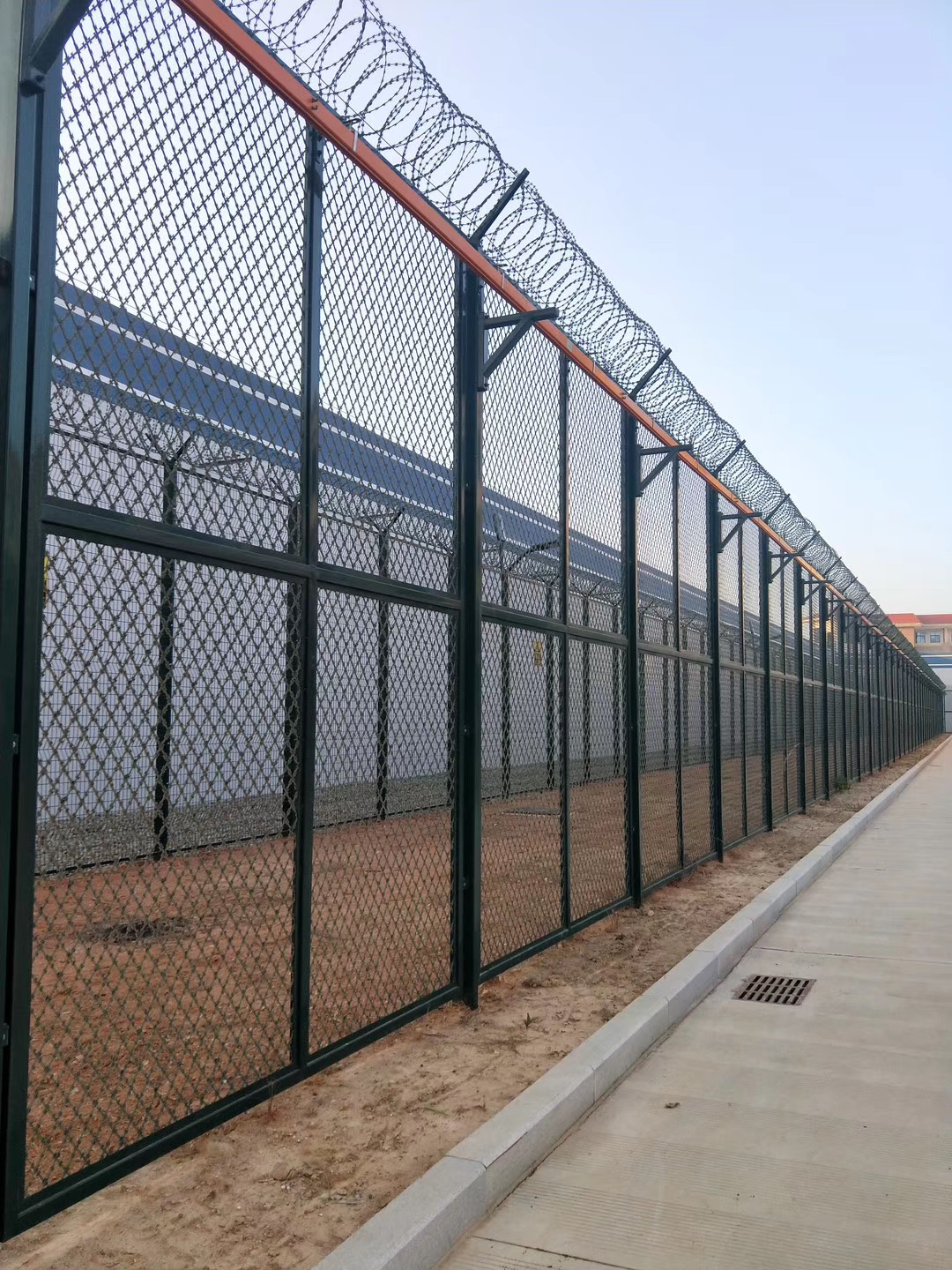 監獄焊接刀片刺網具有結構新穎、堅固緊密、網面平整、網孔均勻、刀鋒銳利、防攀爬、耐腐蝕性強等特點,是近幾年新興的防攀爬效果較好的種隔離網。