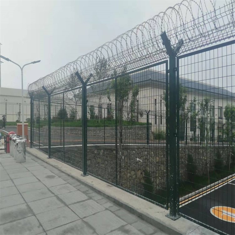 監獄隔離網由網片,立柱,刀刺網組合而成,監獄隔離網網片通常四周焊接邊框以增加整體的剛度和防護力度,