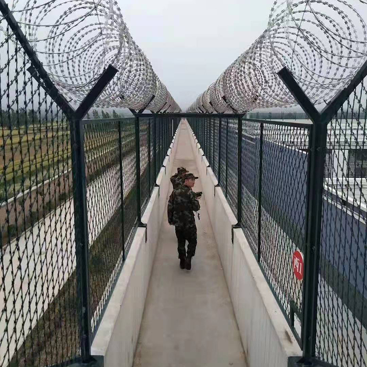 監獄隔離鋼網墻直接在地面上安裝時,刺繩的安裝方法有兩種:Y型安裝法和直線安裝法。Y型安裝法是安裝滾筒刀片刺繩的方法;直線安裝法是安裝普通刺繩的方法,直接把刺繩拉開固定在立柱或單獨的固定架上。