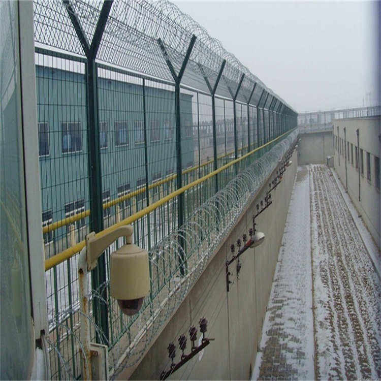 監獄防攀爬鋼網墻的設計核心在于材質的高強度和結構的防攀爬性。主體框架與網片均應選用防切割、防拉伸的鋼材,表面需經熱鍍鋅或浸塑等防腐處理。網孔尺寸需精密計算,防止手腳插入借力;整體高度通常不低于3米,立柱間距與埋深需保證結構穩固,不易被推倒或拔出。頂部多設計為Y型、蛇腹型或加裝刺絲滾籠,底部則需設置混凝土基礎或地下防逃網,防止挖掘。同時,網片需保證良好通透性,不影響值守人員觀察,顏色選擇也應兼具協調性與警示作用。