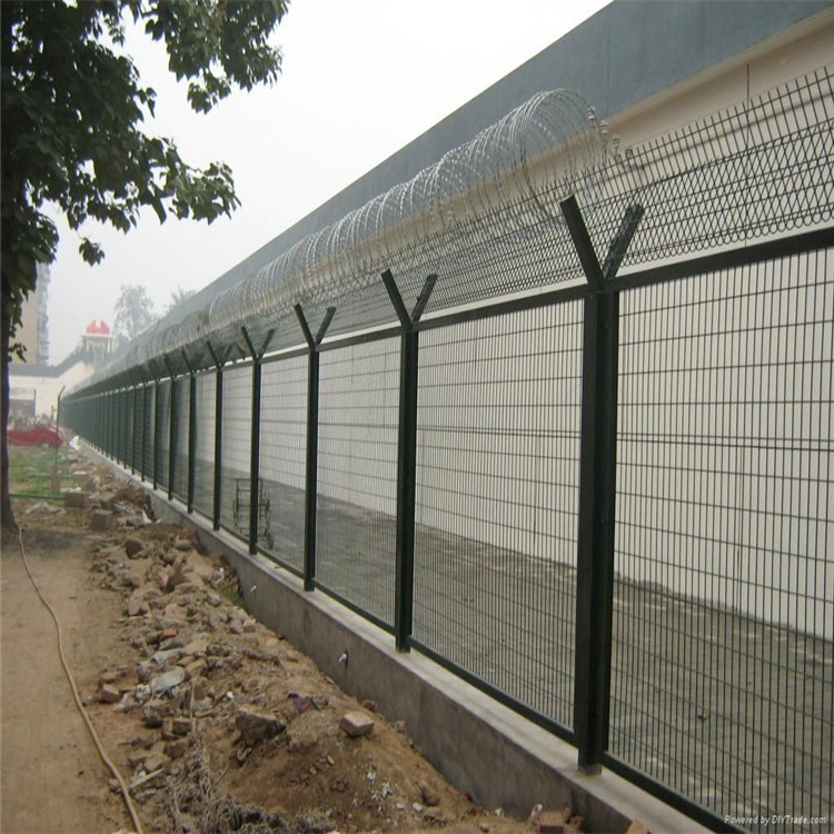 監獄圍墻隔離網分為熱浸塑和靜電噴涂。熱浸塑是加熱護欄網,然后蘸上粉末再繼續加熱,高溫使粉末攀附在監獄護欄網上,主要是通過溫度來控制上塑量。一般浸塑的上塑量在0.8-1.2mm之間,常用顏色有草綠色、墨綠色、白色等。靜電噴涂也稱噴塑,靜電噴涂顧名思義,就是利用靜電吸附粉末,當然也是在高溫的條件下。靜電噴涂的上塑量在0.1-0.2mm之間,常用顏色有草綠色、墨綠色、白色、藍色、黃色、黑色、紅色等。浸塑和靜電噴涂各自有自身的優點,浸塑上塑量高,不容易掉塑;靜電噴涂表面特別平滑,顏色鮮艷,非常美觀。
