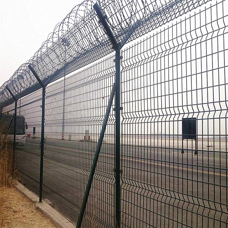 機(jī)場Y型柱角鋼隔離柵又被稱為刀片刺籠隔離網(wǎng),機(jī)場Y型柱角鋼隔離柵最大的特點就是立柱頂端呈Y字型,上面架設(shè)刀片刺繩,大大提高了隔離柵的防御等級。該產(chǎn)品的網(wǎng)面與三角折彎隔離柵的網(wǎng)面是相同的,經(jīng)過折彎處理增加強(qiáng)度四周焊接50x50角鋼,并且減少單調(diào)乏味。為了避免攀爬發(fā)生,頂端加設(shè)刺絲滾籠,這樣會增加嚇阻作用,起到防范,并且在外型上形成獨有的特點,令人過目難忘。