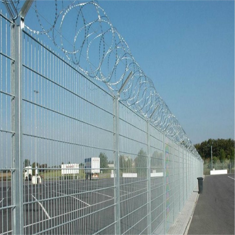 在結構設計上,機場護欄網通常采用Y型支架立柱與加強型焊接片網的組合形式。立柱多為60×60毫米矩形鋼,頂端設置Y型支架;網片則采用直徑4.0-5.0毫米的低碳鋼絲焊接而成,網孔規格常見為50×100毫米或50×200毫米。網片中帶有V型加強筋,這一設計有助于提升網面整體強度,使其能夠承受一定程度的沖擊。根據民航標準要求,飛行區圍欄凈高度不低于2.5米,豎筋間距不大于100毫米,立柱間距不超過3米,這些尺寸規定為平衡防護效果與視覺通透性提供了依據。